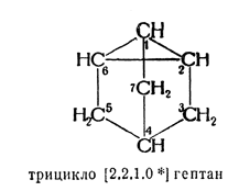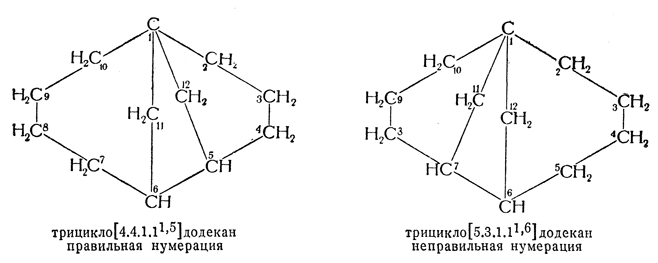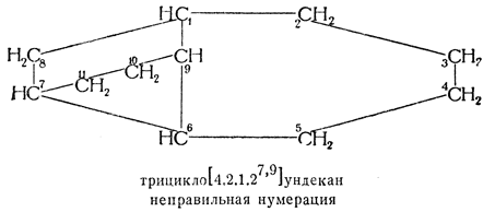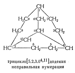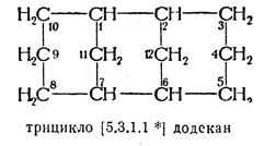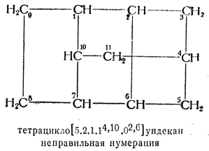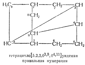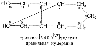 32.11. — Циклические углеводородные системы, состоящие из трех или более колец, могут быть названы в соответствии с принципами, изложенными в правиле А—31. Вместо префикса бицикло- перед названием углеводорода с открытой цепью с тем же числом атомов углерода ставят соответствующий префикс трицикло-, тетрацикло- и т. д.