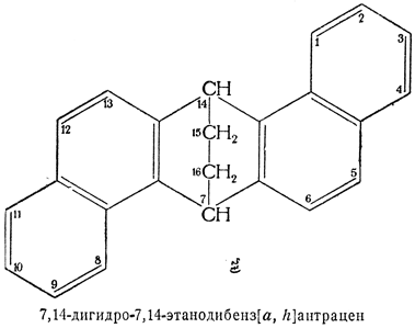 34.1. — Полициклические углеводородные системы, которые, согласно правилу А—21, можно рассматривать как орто-конденсированные или орто- и пери-конденсированные и имеющие в то же время другие мостики, которые можно рассматривать как заместители, называют, приняв за основу орто- или орто- и пери-конденсированную систему. Дополнительные мостики — заместители обозначают затем префиксами, образованными из названия соответствующего углеводорода заменой окончания -ан, -ен и т. д. окончаниями -ано, -ено и т. д.; положение мостиков указывается номерами точек присоединения к основной системе. Если имеются мостики различных типов, их перечисляют в алфавитном порядке.