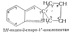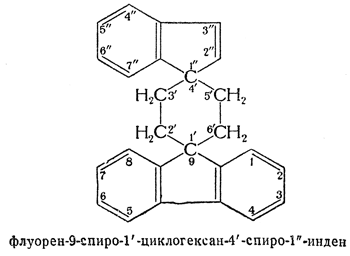 42.1. (вариант к правилам А—41.1 и А—41.2). — Когда спиросвязью соединены два неодинаковых циклических компонента, в названии спиросоединения в начале ставится название большего компонента, затем — аффикс -спиро-, а после него название меньшего компонента. Между аффиксом -спиро- и названием каждого компонента ставится номер, обозначающий положение спироатома в соответствующей кольцевой системе, причем эти номера должны быть настолько низкими, насколько это позволяет установленная для компонента нумерация. В каждом компоненте принятый для него порядок нумерации сохраняется, но номера вторых компонентов обозначаются штрихами. Если выбор нумерации свободный, номер 1 можно не указывать.