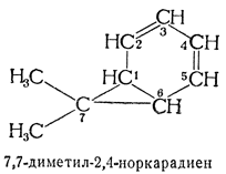 74.2. — Бициклические терпеновые углеводороды, имеющие скелеты формул III, IV или V и, кроме метила (или метилена — если одна метиленовая группа уже имеется}, дополнительные боковые цепи, называют соответственно: каран, карен, карадиен и т. д.; пинан, пинен, пинадиен и т. д.; борнан, борнен, борнадиен и г. д. Их нумеруют как установлено, соответственно, для карана (формула III), пинана (формула IV) и борнана (формула V). Другие углеводороды, содержащие кольцевой скелет карана, пинана или борнана, получают названия соответственно от норкарана (формула VI), норпинана (формула VII) или норборнана (формула VIII). Эти названия более предпочтительны, чем названия от бицикло[4.1.0]гептана, бицикло[3.1.1]гептана или бицикло[2.2.1]гептана. Соединения с нор-названиями нумеруют по системе, принятой для бициклосоединений (см. правило А—31).