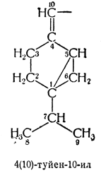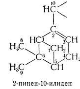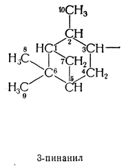 75.2. — Радикалы, получаемые из ментана, пинана, туйана, карана, борнана, норкарана, норпинана и норборнана, называют в соответствии с принципами, изложенными в правилах А—1.2 и А—11.4. Насыщенные радикалы пинана называются пинанил, пинанилен и пинанилиден. Нумерация углеводородов сохраняется, и точка или точки присоединения в кольце или в боковой цепи должны получить по возможности настолько наиболее низкие номера, насколько это допускает установленная для углеводорода нумерация.