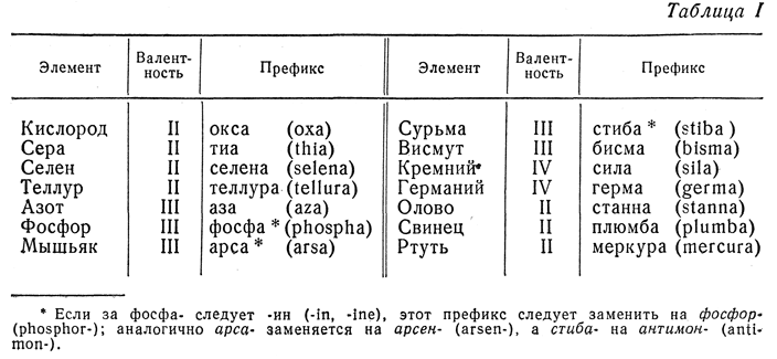 1.3. — Повторение одного и того же гетероатома обозначается префиксом ди-, три- и г. д., который ставится перед соответствующим «а»-обозначением гетероатома (табл. I).