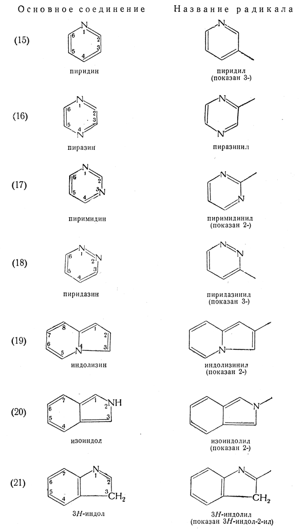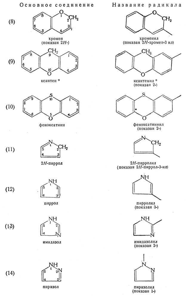 2.11. — Ниже приведен неполный перечень тривиальных и полутривиальных названий, которые сохраняются для соответствующих соединений и служат основой названий конденсированных систем. Они расположены в порядке, противоположном тому, который принят в правиле В—3. Названия показанных радикалов образуются по правилу В—5.
