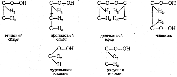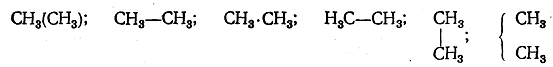 Что же касается способа написания структурных формул, то Бутлеров справедливо считал этот вопрос второстепенным: «Помня, что дело не в форме, а в сущности, в понятии, в идее,— и принимая во внимание, что формулами, обозначающими изомерию, логически-необходимо выражать настоящее частицы, т. е. некоторые химические отношения, в ней существующие,— не трудно притти к убеждению, что всякий способ писания может быть хорош, лишь бы только он с удобством выражал эти отношения. Весьма естественно даже употреблять разные способы, предпочитая тот, который является более выразительным для данного случая. Например, этан С2Н6 почти совершенно безразлично может быть изображен: