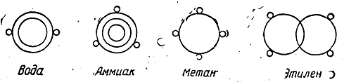 Другая попытка изображения органических соединений конституционными формулами была сделана в 1861 г. Лошмидтом. При построении своих формул Лошмидт рассматривал атомы как мельчайшие материальные частицы, подвергающиеся действию сил притяжения и отталкивания. Эти силы при сближении атомов уравновешиваются, и различные атомы удерживаются друг около друга в некотором равновесном положении. Сферы действия атомных сил Ло-шмидт условно обозначал кружками (например, атомы углерода и водорода — простыми кружками, кислорода—двойными, азота—тройными).