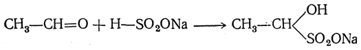 2. Образование бисульфитных соединений Присоединением молекулы кислого сернистокислого натрия (бисульфита) получаются так называемые бисульфитные соединения, причем водород присоединяется к кислороду карбонильной группы, а остаток SO2ONa — к углеродному атому: