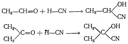 3. Присоединение синильной кислоты Присоединение синильной кислоты к карбонильной группе также происходит таким образом, что атом водорода присоединяется к кислородному атому, а остаток CN к атому углерода, например: