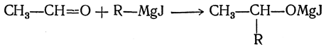 4. Присоединение металлоорганических соединений При этой реакции углеводородный радикал металлоорганического соединения присоединяется к углероду, а остальная часть его молекулы — к кислороду, например: