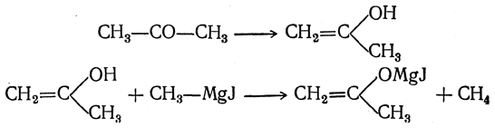 Наряду с этой реакцией, при действии магнийорганических соединений на кетоны происходит изомеризация кетонов в ненасыщенные спирты и образование смешанных магниевых алкоголятов этих спиртов (Гриньяр):