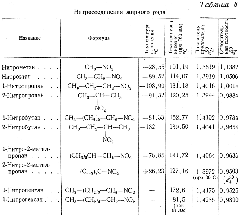 Низшие гомологи нитросоединений — жидкости, не имеющие неприятного запаха, нерастворимые в воде, смешивающиеся со спиртом и эфиром. Нитрометан кипит при 101° С; у последующих гомологов температуры кипения повышаются, обнаруживая правильности, общие для всех гомологических рядов. Плотности низших нитросоединений больше единицы; с увеличением молекулярного веса плотности нитросоединений уменьшаются.