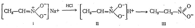 Изомеризация нейтральных нитросоединений в кислые изонитросоединения подтверждается тем, что при действии сильной кислоты на соль изонитросоединения (I) нерастворимое в воде нитросоединение (III) получается не сразу; сначала выделяется хорошо растворимое в воде изонитросоединение (II), лишь постепенно превращающееся в нитросоединение (III):