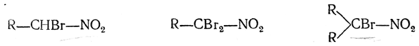 4. Действие галоидов на щелочные растворы нитросоединений. Этим способом можно заместить во вторичных нитросоединениях один, а в первичных нитросоединениях один или два атома водорода на атомы галоида и получить таким образом соединения: