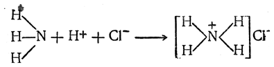 Аммиак, соединяясь с кислотами, образует соли аммония. Они не являются соединениями пятивалентного азота, как это полагали ранее. Реакцию образования солей аммония следует представлять себе таким образом: ион водорода (протон) присоединяется к атому азота, обладающему свободной парой электронов, причем образуется ковалентная связь между азотом и водородом. Атом азота приобретает положительный заряд, и вновь возникающее образование становится катионом, который связывается с анионом хлора ионной связью: