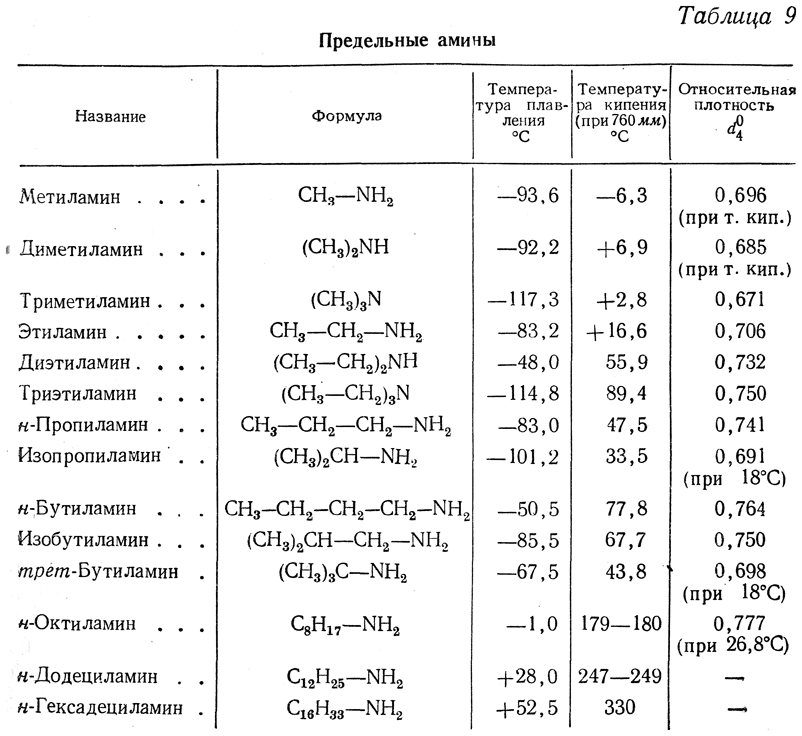 Высшие амины — твердые, нерастворимые в воде вещества, лишенные запаха. Температуры кипения первичных аминов значительно ниже, чем у соответствующих спиртов.