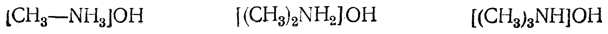 В водных растворах амины, подобно аммиаку, содержатся в виде гидратов соответствующих аммониевых оснований, например