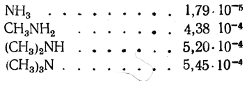 Замена в аммиаке первых двух атомов водорода на алкилы усиливает основные свойства, как это видно из сопоставления констант электролитической диссоциации: