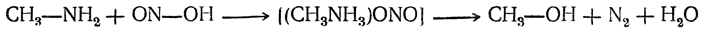 а) При действии азотистой кислоты на первичные амины получаются их азотистокислые соли, разлагающиеся уже при обычной температуре, и еще быстрее при нагревании, с выделением газообразного азота; амин при этом превращается в спирт: