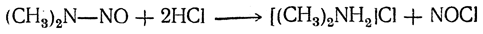 Нитрозамины — нейтральные вещества с характерным запахом. Они могут быть извлечены из водного раствора, например, эфиром, и из них может быть различными способами получен исходный вторичный амин. Так, например, при нагревании нитрозаминов с концентрированной соляной кислотой происходит следующая реакция: