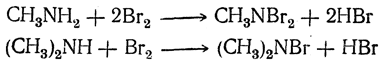 4. Действие галоидов. Действием хлора или брома в присутствии щелочи на первичные и вторичные амины можно заменить на галоид атомы водорода в аминогруппе и получить галоидамины: