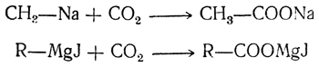 2. Действие двуокиси углерода на металлоорганические соединения (реакция карбонирования). Чаще всего для этой реакции применяются натрийорганические соединения (Ванклин) и смешанные магнийорганические соединения (Гриньяр):