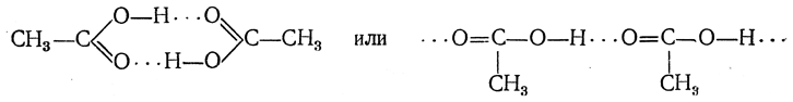 Образование ассоциированных молекул, наблюдаемое у многих гидроксилсодержащих соединений, объясняется возникновением так называемых водородных связей, причем образуются лабильные циклические или линейные (главным образом димерные) структуры. Например, для уксусной кислоты: