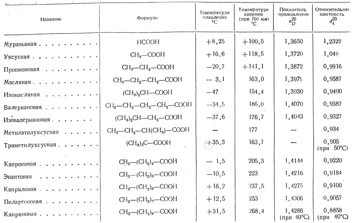 Низшие кислоты легко перегоняются как сами, так и вместес водяным паром, и называются поэтому летучими жирными кислотами. Правильности в повышении температур кипения кислот те же, что и в других гомологических рядах.