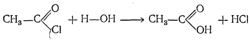 1. Действие воды. С водой низшие хлорангидриды реагируют чрезвычайно энергично, образуя соответствующую карбоновую кислоту и соляную кислоту: