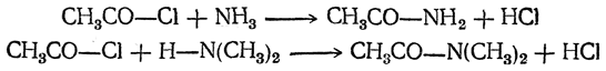 3. Действие аммиака и аминов. При взаимодействии хлорангидридов с аммиаком (или с аминами, первичными и вторичными) получаются амиды кислот (или замещенные амиды кислот), например:
