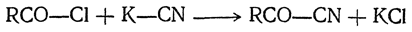 4. Действие цианистого калия. При реакции хлорангидрида с цианистым калием происходит обмен галоида на цианогруппу: