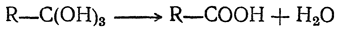 Подобно тому как двухатомные спирты типов R—СН(ОН)2 и R2C(OH)2 неустойчивы и, распадаясь, образуют альдегиды и кетоны, трехатомные спирты типа R—С(ОН)3 распадаются с образованием кислот: