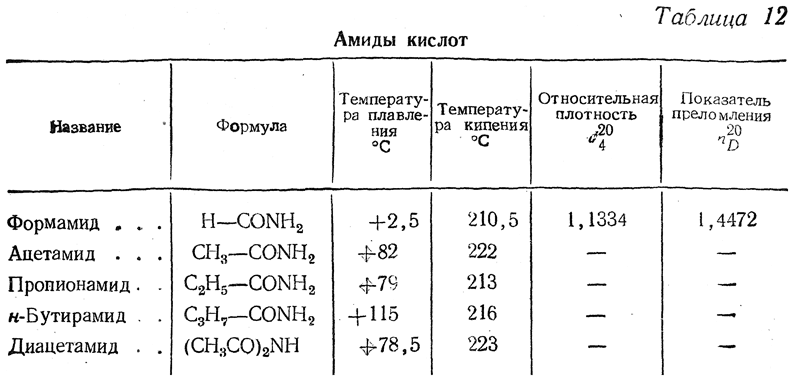 За исключением жидкого амида муравьиной кислоты (формамида), остальные амиды — кристаллические вещества. Чистые амиды почти не имеют запаха. Низшие амиды растворимы в воде.