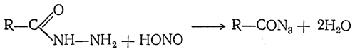 Это — летучие, взрывчатые кристаллические вещества. При нагревании в инертных растворителях, а иногда и самопроизвольно при комнатной температуре азиды кислот перегруппировываются в эфиры изоциановой кислоты (перегруппировка Курциуса). Реакция протекает, вероятно, по схеме, аналогичной схеме реакции Гофмана. Образовавшиеся в результате перегруппировки эфиры изоциановой кислоты действием воды можно превратить в амины или в симметричные диалкилмочевины, действием спирта — в уретаны, действием аминов — в несимметричные алкилмочевины и, наконец, действием безводных кислот или ангидридов кислот — в N-ациламины. Получение всех этих веществ из карбоновых кислот через их азиды объединяют под названием реакции Курциуса.