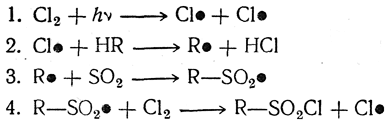 Сульфохлорирование является цепной радикальной реакцией. Фотохимический процесс начинается с расщепления молекулы хлора под влиянием энергии света: