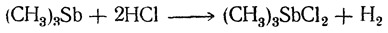 Триметилстибин (CH3)3Sb — нерастворимая в воде тяжелая (относительная плотность 1,52) жидкость с запахом лука, самовоспламеняющаяся на воздухе, кипящая при 81° С. Жадно соединяясь с серой или галоидами, триметилстибин дает соединения (CH3)3SbS и (CH3)3SbCl2 с уже несколько солеобразными свойствами, напоминающие соли металлов второй группы. Металлический характер третичных стибинов проявляется также в их способности выделять водород при взаимодействии с концентрированной соляной кислотой:
