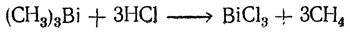 Триметилвисмутин (CH3)3Bi — жидкость относительной плотности 2,3, кипящая при 110° С. Не самовоспламеняется на воздухе, но при нагревании в присутствии воздуха разлагается со взрывом. При взаимодействии с концентрированной соляной кислотой триметилвисмутин ведет себя уже скорее как металлоорганическое соединение, выделяя метан: