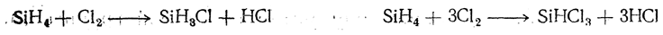 Щелочи и кислоты ускоряют такое разложение. Под действием галоидов водородные атомы силанов постепенно замещаются на атомы галоида: