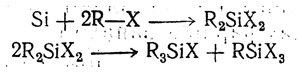 Галоидные производные могут получаться также действием металлоорганических соединений на четыреххлористый кремний. Большое значение для промышленного синтеза кремнийорганических соединений приобрел способ получения алкилгалоидсиланов непосредственным действием галоидных алкилов на кремний в присутствии меди или серебра: