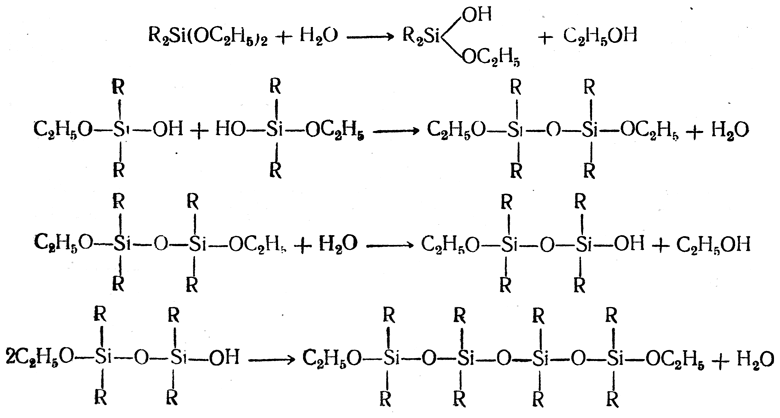 Кремнийорганические соединения представляют большой интерес в связи с возможностью получения на их основе ряда ценных материалов, обладающих значительной теплостойкостью: смазочных масел, материалов для пропитки и покрытий, эластичных материалов и т. п. Получение применяемых для этих целей полимерных кремнийорганических соединений основывается на гидролизе алкилгалоидсиланов или алкилалкоксисиланов (алкилтриэтокси- и диалкилдиэтоксисиланов). Процесс образования высокополимерных соединений из алкилалкоксисиланов, вероятно, протекает в такой последовательности: