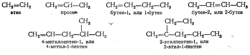 По женевской номенклатуре, названия этиленовых углеводородов производятся от названий парафиновых углеводородов, с изменением окончания ан на частицу ен ис приставкой цифры, указывающей, после какого по счету от начала главной цепи атома углерода находится двойная связь. При этом подразумевается, что главная цепь включает двойную связь, даже если она в результате этого окажется не самой длинной. Если в молекуле можно выделить несколько цепей, включающих двойную связь, то за главную принимается самая длинная из них. Например: