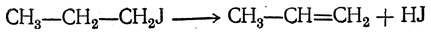 3. Отщепление галоидоводородов от галоидных а л к и л о в. При действии спиртовых растворов едких щелочей на галоидные алкилы происходит отщепление элементов галоидоводородной кислоты от молекулы галоидного алкила (за исключением иодистого метила). Галоид и водород отщепляются от двух соседних атомов углерода, и образуется этиленовый углеводород, например: