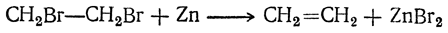4. Отщепление двух атомов галоида от соседних углеродных атомов. Этиленовая связь образуется также при отнятии галоида от таких двугалоидных соединений, в которых атомы галоида связаны с двумя соседними атомами углерода. Отнятие галоида обыкновенно производится при помощи металлов, например действием цинковой пыли на спиртовый раствор дибромэтана: