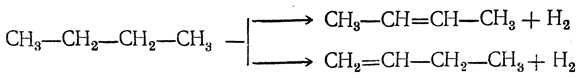 6. Каталитическая дегидрогенизация предельных углеводородов. Процесс осуществляется при температурах порядка 400—600° С над смешанными катализаторами, содержащими окислы некоторых тяжелых металлов (Cr2O3 и др.). Например: