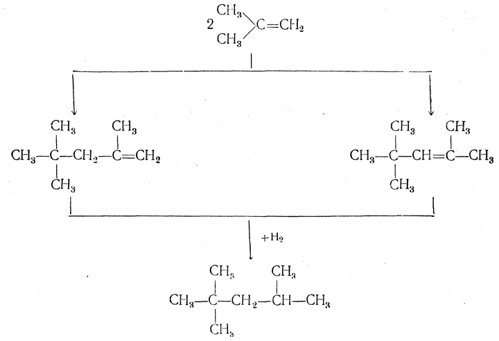 Под влиянием различных конденсирующих агентов (серная кислота, хлористый цинк, фтористый бор и пр.) может происходить соединение двух или нескольких молекул этиленовых углеводородов. Исследования А. М. Бутлерова по полимеризации изобутилена С4Н8 под действием серной кислоты показали, что при этом получаются в основном два продукта: диизобутилен C8H16 и в несколько меньшем количестве — триизобутилен C12H24. Диизобутилен (т. кип. 101—102° С) представляет собой смесь двух изомеров — более низкокипящего 2,4,4-триметилпентена-1 и более высококипящего 2,4,4-триметилпентена-2. Эта смесь играет важную роль при синтезе изооктана — компонента моторного топлива с октановым числом 100. При гидрировании оба изомера превращаются в 2,2,4-триметилпентан (изооктан):