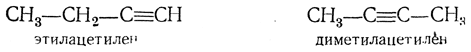 Общая формула CnH2n – 2. Два трехвалентных радикала СН (радикал метенил, или метин) образуют молекулу С2Н2. Углеводороду этого состава, называемому ацетиленом, приписывается строение СН≡СН с тройной, или ацетиленовой, связью между атомами углерода. Первый его гомолог СН3—С≡СН называется метилацетиленом