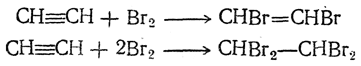 2. Присоединение галоидов. Галоиды также присоединяются к тройной связи или с образованием двузамещенного галоидпроизводного этиленового углеводорода (присоединение одной молекулы галоида), или с образованием четырехзамещенных галоидпроизводных парафиновых углеводородов (присоединение двух молекул галоида):