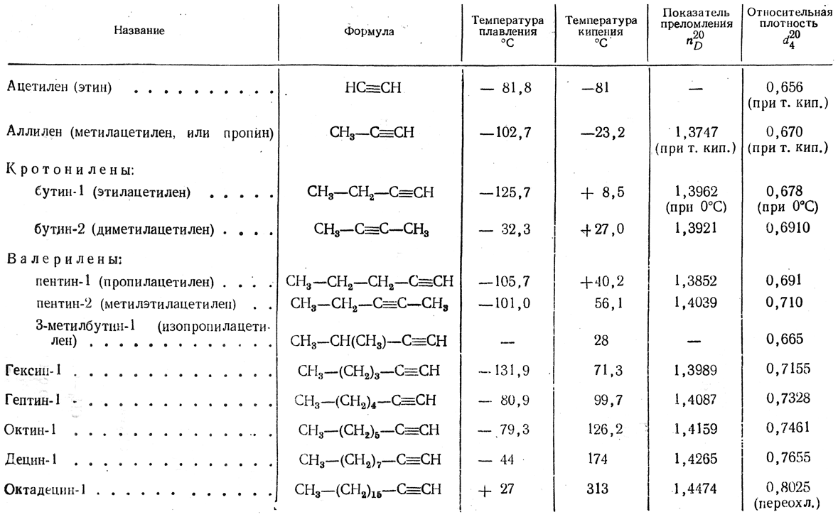 Таблица 18. Ацетиленовые углеводороды