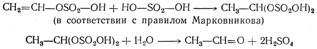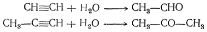 4. Присоединение воды. Вода легко присоединяется к ацетиленовым углеводородам под действием разных катализаторов, но особенно легко — в присутствии солей окиси ртути в сернокислотном растворе (М. Г. Кучеров, 1881). При этом из ацетилена получается уксусный альдегид, а из гомологов ацетилена — кетоны: