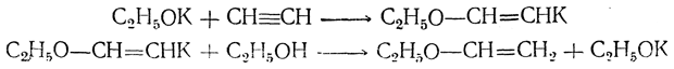 5. Присоединение спиртов. В присутствии кислых катализаторов, а особенно легко под действием едких щелочей (А. Е. Фаворский, М. Ф. Шостаковский) спирты присоединяются к ацетиленовым углеводородам, образуя виниловые эфиры,