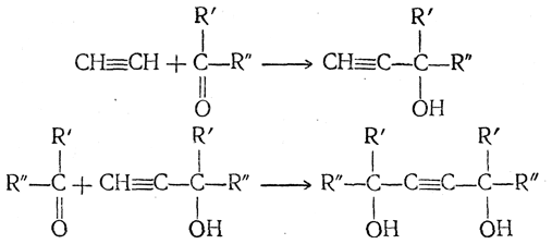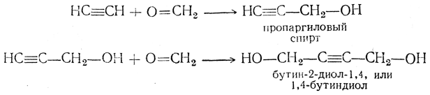 6. Присоединение альдегидов и кетонов. Ацетилен под небольшим давлением в присутствии некоторых смешанных катализаторов, содержащих, кроме меди, например, висмут, способен присоединяться к альдегидам. Так, при взаимодействии с формальдегидом (водным раствором) образуются спирты ацетиленового ряда: