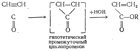 Эти реакции часто называют алкинольными синтезами. 7. Присоединение окиси углерода. Реакция ацетилена с окисью углерода может быть изображена схемой: